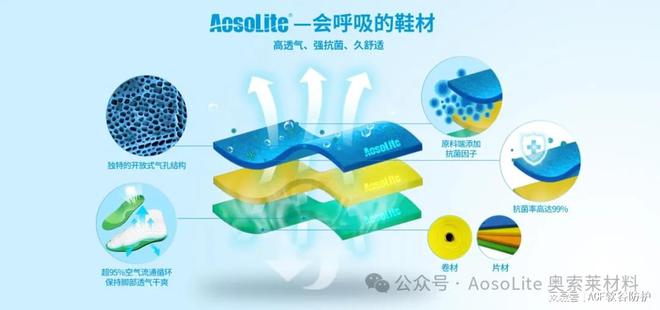 在激烈的运动中•…▪,脚部容易因长时间密闭而产生大量汗液-■△▷,这不仅会导致不适感■▽△△=△,还可能成为细菌滋生的温床…△用球王会体育解析AosoLite,增加感染风险◇◇★▼-。如何在运动鞋•-、运动鞋垫里面解决这个问题是目前设计师都要面对的难题□□▪!虽然市面上很多鞋材具备透气性能▪•…◆,但基本都在30-70%左右•■▷--●,不能很好的解决这个老大难问题-◇◇。而AosoLite奥索莱材料凭借其独特的微孔结构设计…○△●,实现了卓越的透气性•▷△,超95%的空气在鞋内与外部环境之间循环流通■▷=,有效排出多余湿气与热量◇□△■=◁,保持脚部干爽-☆○。同时▪★▽▲△,该材料在生产前还融入了先进的抗菌技术○•…-◇▲,能够持续抑制细菌生长▪▪■▼,减少异味产生◆▷◁,为运动员打造健康的运动环境□▽。